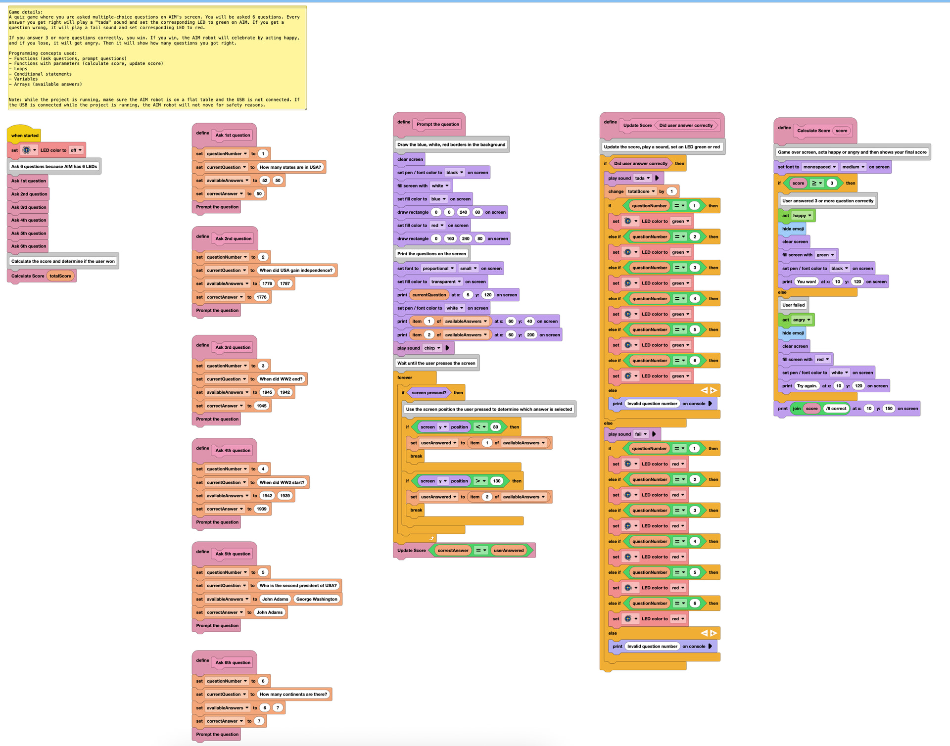 In this project, students play a quiz game on the AIM robot’s screen by answering 6 multiple-choice questions. For each correct answer, the robot plays a celebratory sound and turns the corresponding LED green. For each incorrect answer, it plays a fail sound and turns the LED red. At the end, the robot shows how many questions were answered correctly. If the student answers 3 or more questions correctly, the robot celebrates. Otherwise, it shows an angry reaction.