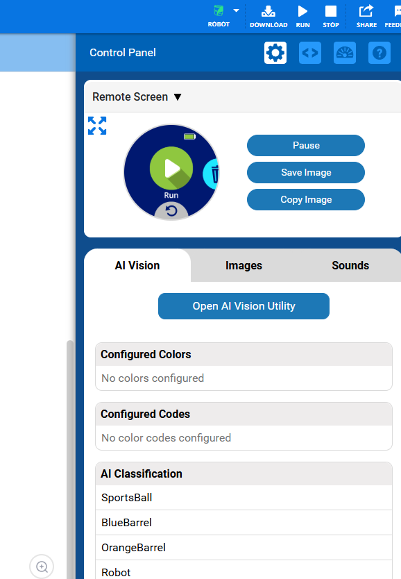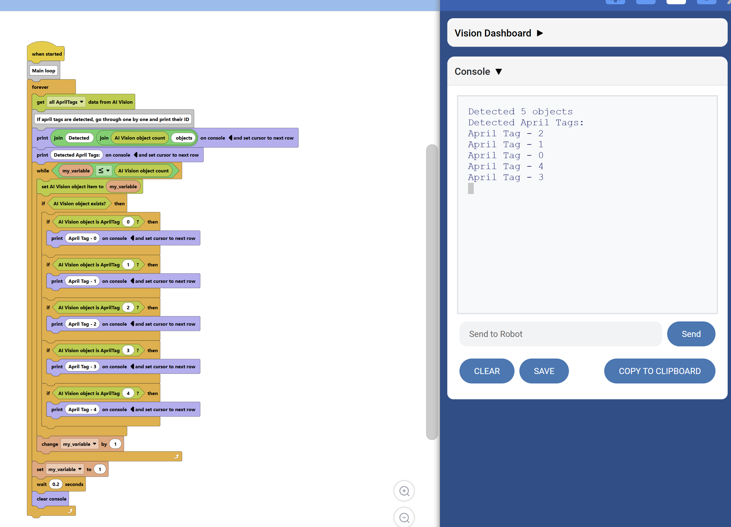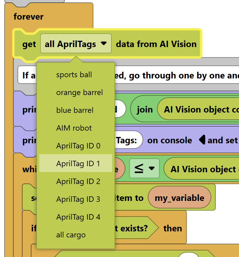 But it isn’t working. My student’s code is ignoring AR Tags 1-5. The Vision Utility detects them, but conditional statements are still saying False when it sees one of the tags. There is no option to Get All Tag data in the drop down on the Get AI Vision data block anymore in VEX Code .
