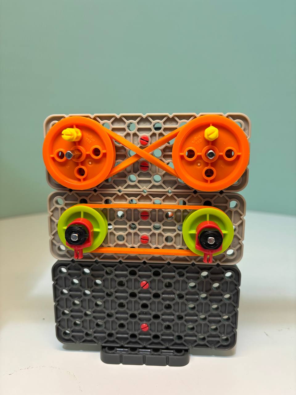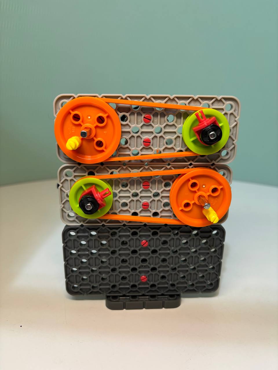 As promised, I’m sharing my new model that helps children explore belt drive mechanisms. This is a modular model that allows students to demonstrate gear reduction and gear increase, as well as count the number of rotations of the driving and driven pulleys.