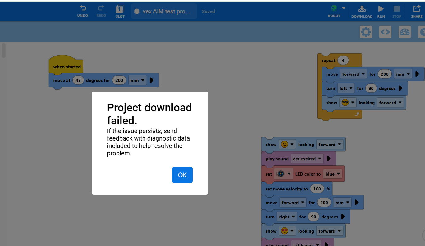 I’m sorry to see that you are having issues with downloading your project. Can you please submit feedback from VEXcode with the diagnostic data option checked right after you get the download failed message. This will let us take a look at what is happening that is causing the download to fail. When you send in the feedback, please make sure that the feedback message mentions that you are having issues downloading your project.