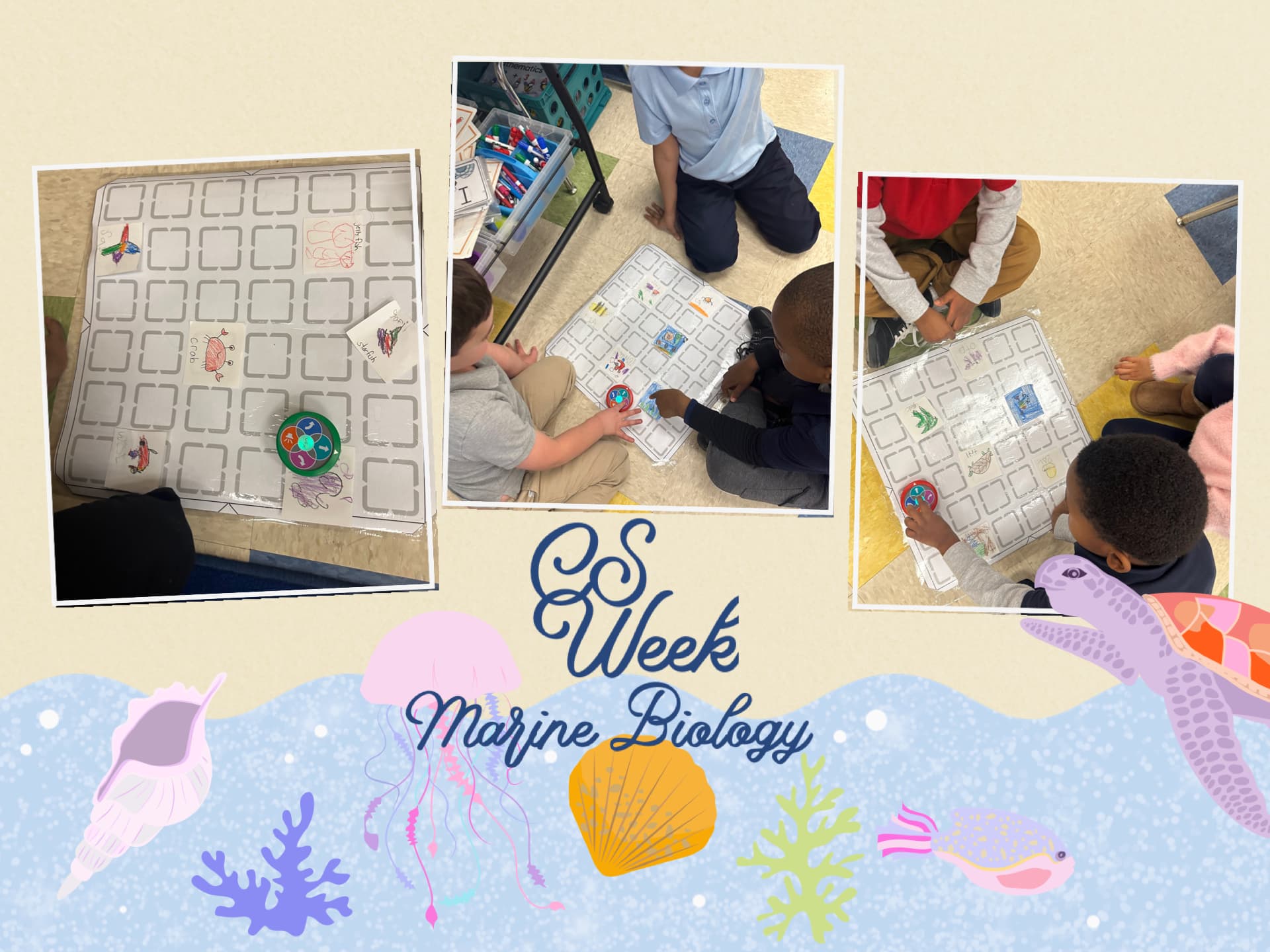 Kindergartners learned all about Marine Biology during CS Week last week. Students illustrated their own marine life animals and then used their VEX 123 robots to code around the animals on printable tiles.
