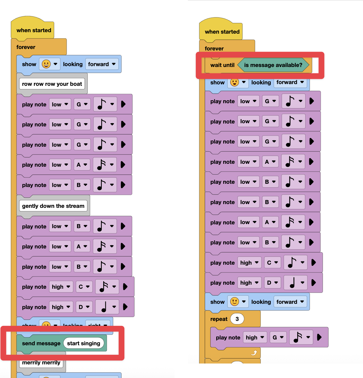 I used two projects to do this - the first (shown on the left below) is downloaded on the robot that starts singing the song. When it gets through the first two lines, it sends a message to the other robot to “start singing”. The second project (shown on the right below) is the downloaded on the robot that is doing the round. It ‘listens’ for the message from the first, then begins singing on its own. Since they’re both wrapped in forever loops, the two will continue singing in the round until the projects are stopped!