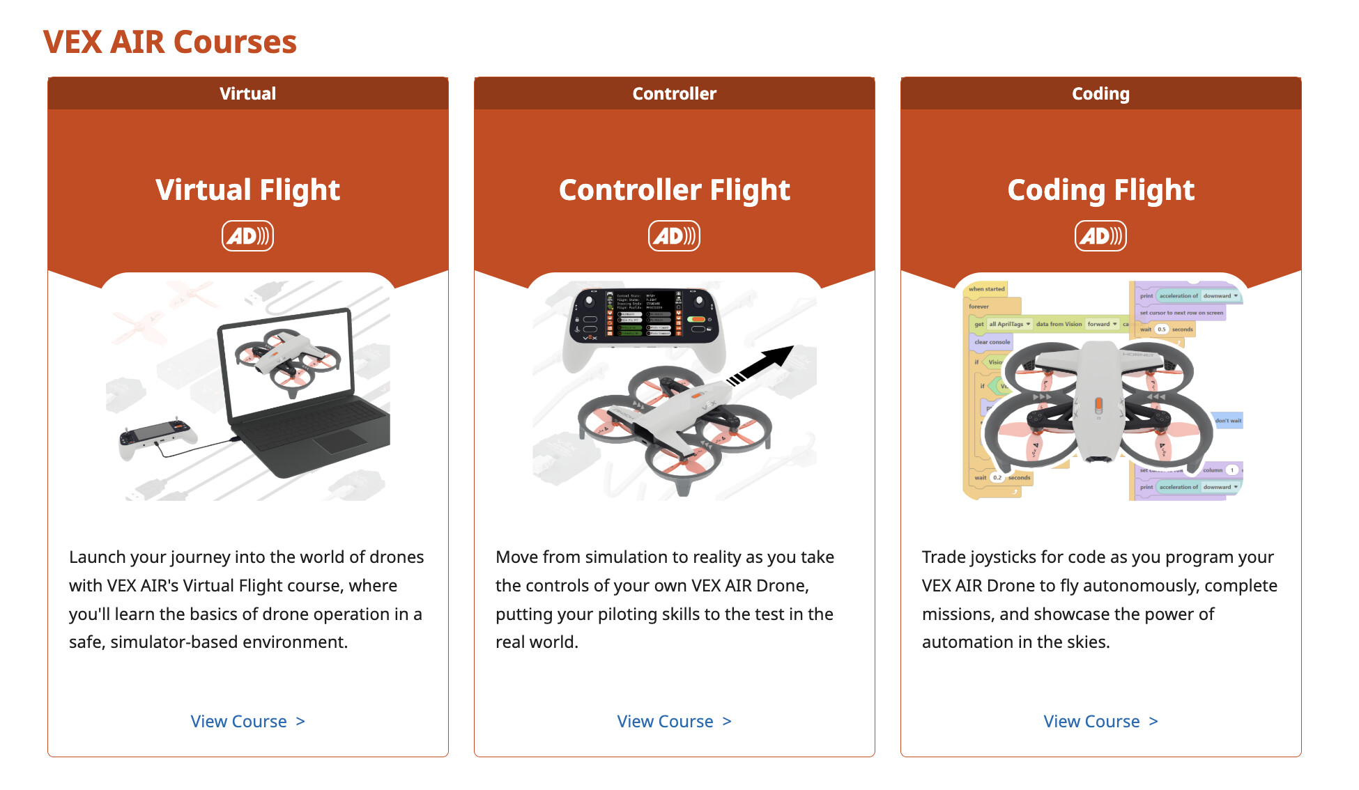 With the release of the VEX AIR Drone rapidly approaching, I wanted to make everyone aware you can now preview the three upcoming courses for teaching with AIR in your classroom! Visit the VEX AIR category on education.vex.com. Select ‘View Course’ at the bottom of each tile for an overview of the content that will be explored in each course.
